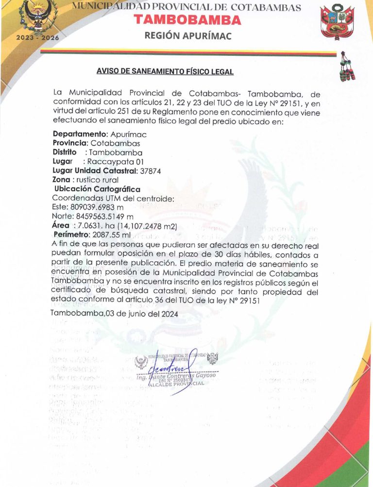 AVISO DE SANEAMIENTO DE FÍSICO LEGAL – RACCAYPATA 01
